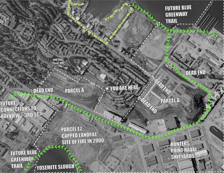 Hunters Point is a residential area area. It was designed to have a suburban pattern with many cul de sacs and dead ends. Use common sense and caution as you would exploring any unfamiliar urban place. The shipyard site is fenced off to all public access. The closest commercial area is located to the west along 3rd St, but there are no connections across the shipyard site.